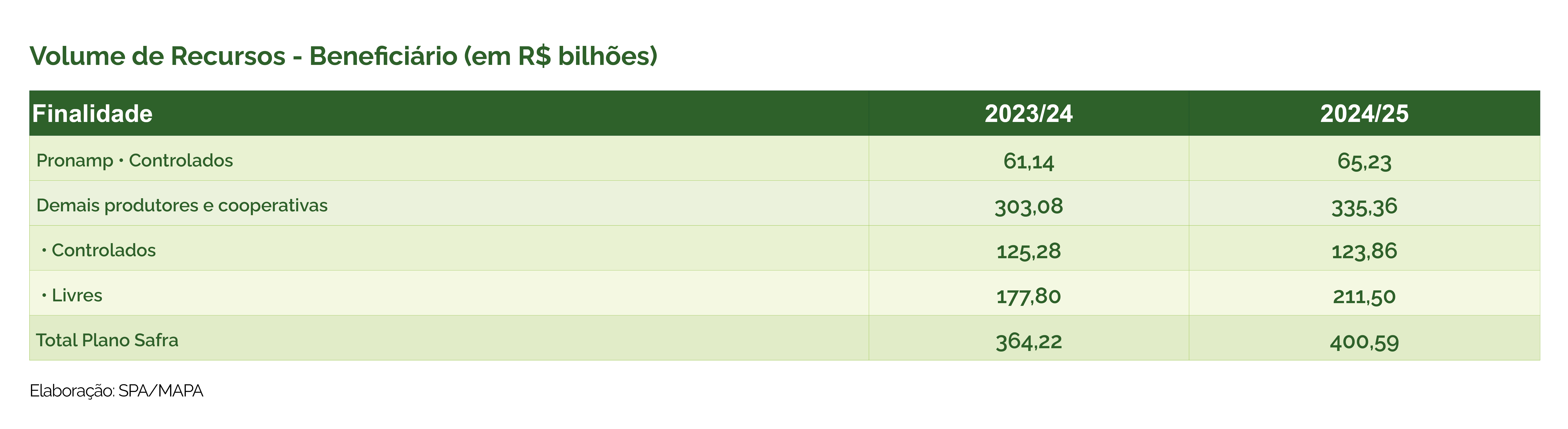 Já em relação aosrecursos por beneficiário, R$ 189,09 bilhões serão com taxas controladas, direcionados para o Programa Nacional de Apoio ao Médio Produtor Rural (Pronamp) e demais produtores e cooperativas,e os outrosR$ 211,5 bilhões destinados a taxas livres.