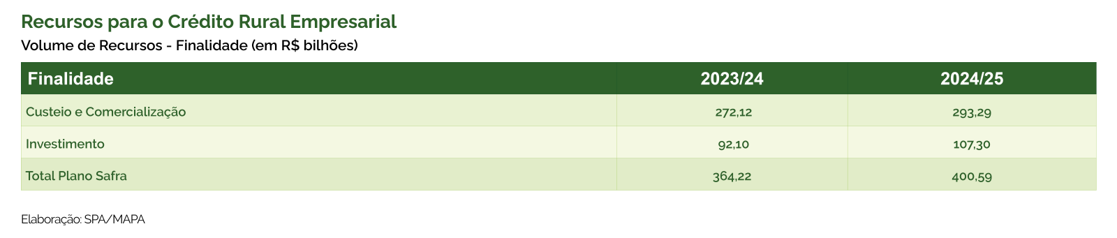Para impulsionar o setor agropecuário brasileiro, o Governo Federal lança oPlano Safra 2024/2025, no âmbito do Ministério da Agricultura e Pecuária (Mapa), oferecendo linhas de crédito, incentivos e políticas agrícolas para médios e grandes produtores. Neste ano safra, são R$ 400,59 bilhões destinados para financiamentos, um aumento de 10% em relação à safra anterior.