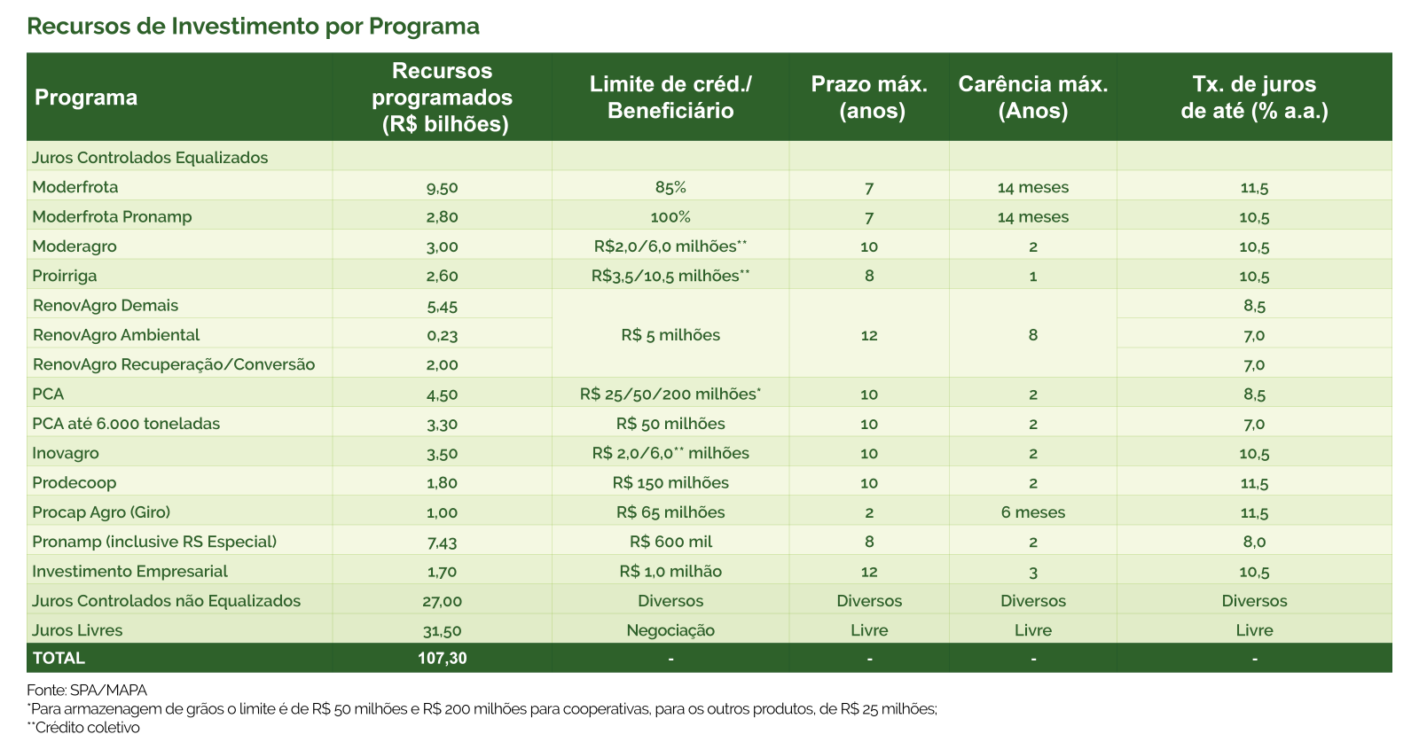 CONFIRA ABAIXO OS PROGRAMAS DE INVESTIMENTOS DO PLANO SAFRA