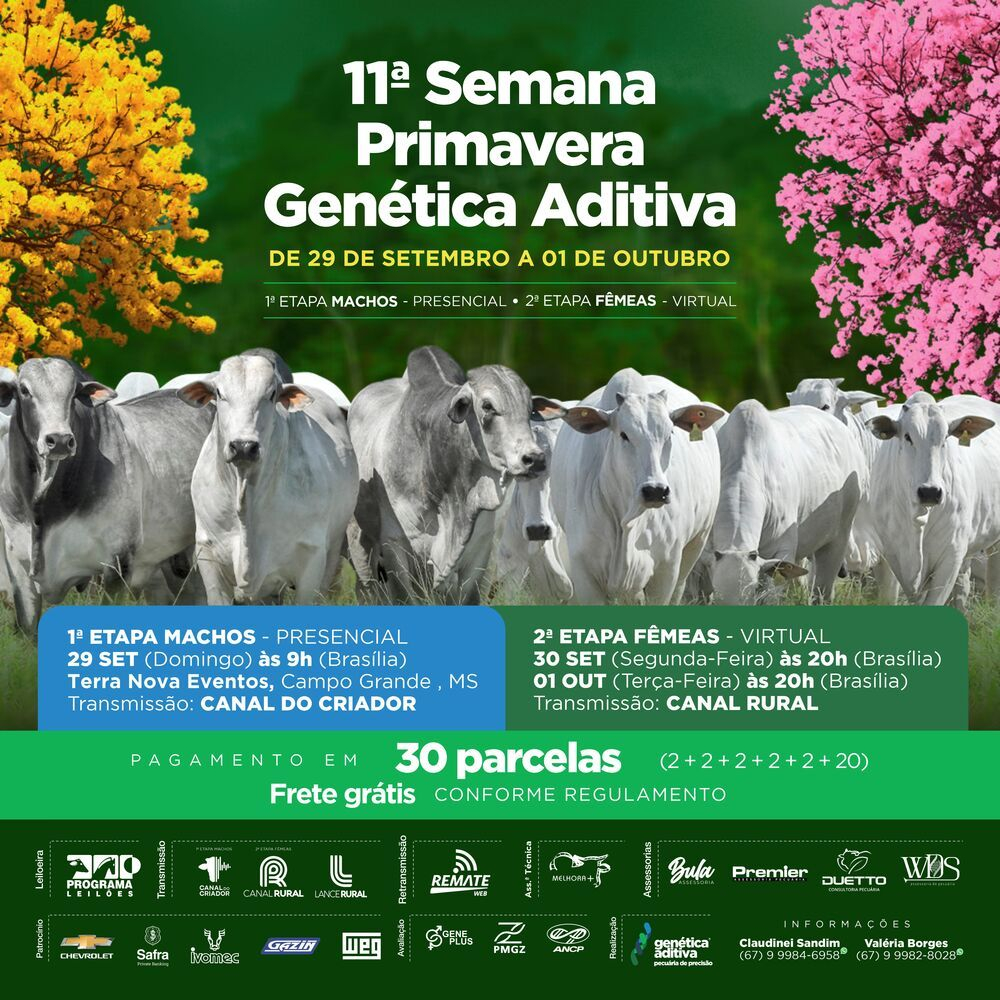 A 11ª Semana Primavera Genética Aditiva acontecerá de 29 de Setembro a 1º de Outubro de 2024. Dividido em duas etapas, serão ofertados Touros Nelore PO e Fêmeas Nelore PO com altas avaliações genéticas consistentes provenientes da seleção de maior influência e impacto no melhoramento genético da raça no Brasil. Consistência nos três Sumários: ANCP, PMGZ e Embrapa Geneplus!